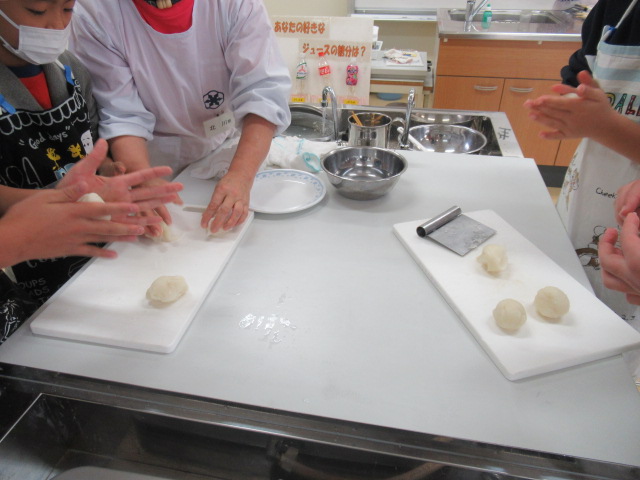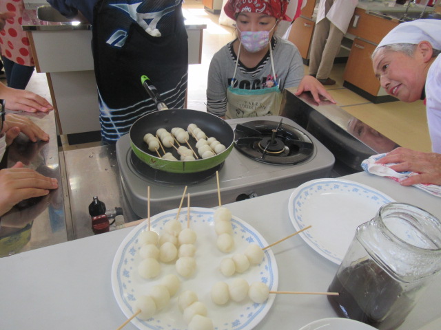 丸めて一口サイズにして3個ずつ串に刺し、フライパンでこげめをつけて、出来上がりです。自分達で作った団子を食べた後は子ども達の笑顔であふれていました。