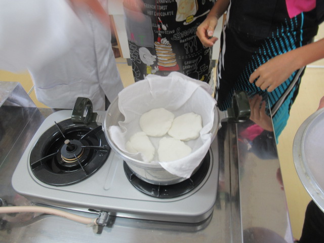 米粉に熱いお湯を混ぜて練りこみ、10分ほど蒸した後等分に切り分ける作業も、子ども達は手際よく行っていました。