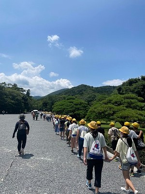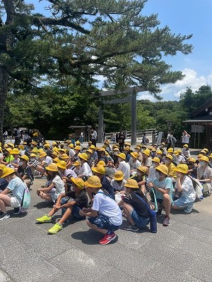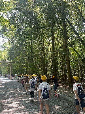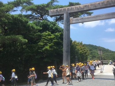 伊勢神宮での様子です。青空が見られる強い日差しの中、伊勢神宮内を見学することができました。広い境内の中を歩き回り、子どもたちは汗だくになりながらも、伊勢神宮の厳かな雰囲気を味わっていました。