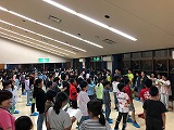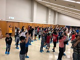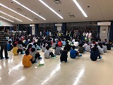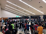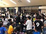 夕食が終わり、宿舎に戻ってレクリエーションを行っています。キャンプファイアは雨のため実施できませんでしたが、室内でじゃんけん列車をしたり、パプリカのダンスをしたりと、楽しい時間を過ごしています。