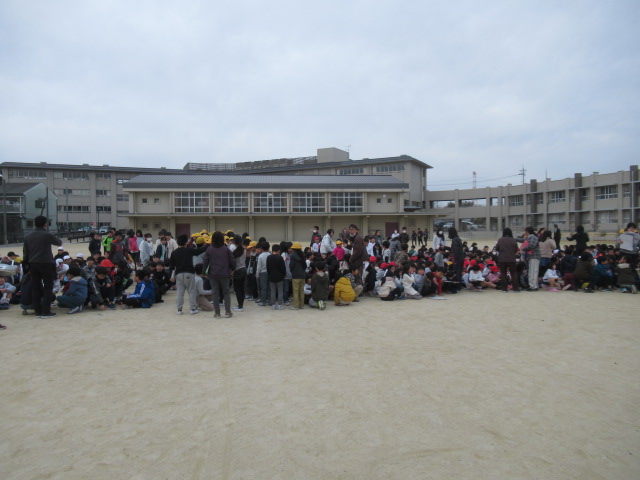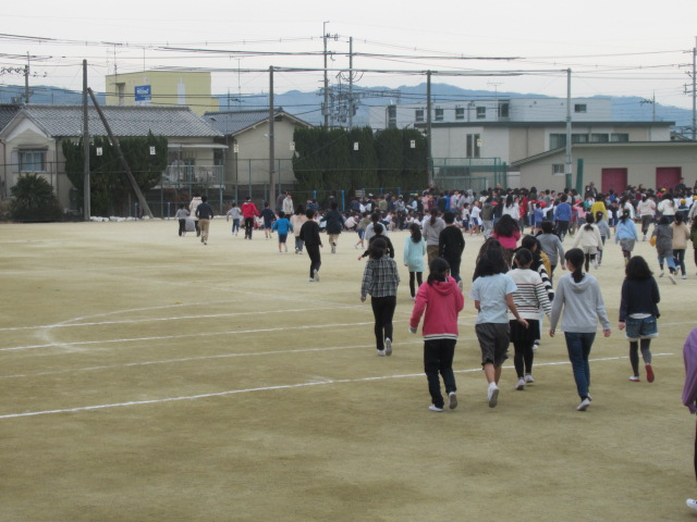 今回は地震の後、校内(東校舎2階)で火災が発生したという想定で行い、子ども達は各々考え、危険を想定しながら運動場の中央に集まり、出席児童全員が避難できました。