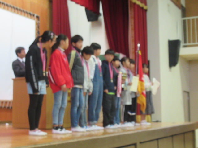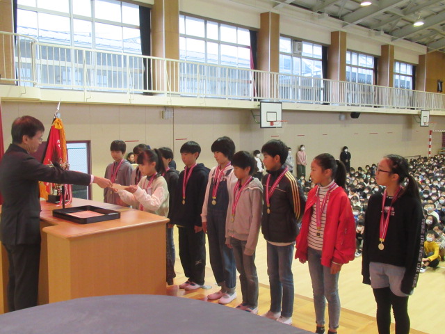 12月2日(月)、全校朝礼を行いました。始めに11月30日(土)に開催された「山城未来っ子EKIDEN大会」で大会新記録という見事な成績で優勝した本校6年生10名への伝達表彰を行いました。