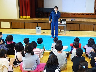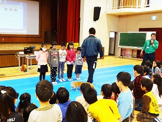 1年生を対象に、動物愛護教室を実施しました。京都府動物愛護センターの方々が先生です。先生方は、犬や、うさぎ、モルモットをつれて学校に来られました。5人の子が前に並んで、犬の性質を実験をしました。犬は嗅覚が発達しているので、においを嗅いで相手を知ろうとします。愛護センターの方が、子どもたちに犬を近づけると、クンクンと子どもたちのにおいを嗅ぎまくります。でも怖がって逃げてはいけません。犬は逃げるものを追いかける性質があるからです。