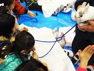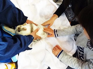 じっとしていると、やがて飽きて離れて行きます。写真は、子どもたちに飽きて、離れていく犬の様子を写しています。また、うさぎやモルモットの心臓の音を聴診器で聞きとる体験もさせて頂きました。小さな身体の中にも、心臓があり、一生懸命動いている!子どもたちは、命の尊さを感じることが出来ました。「生き物のことをよく知り、愛情をもって接することが大切です。」という、動物愛護センターの方のお話が、印象深く心に残りました。動物愛護センターの皆さん、有り難うございました。