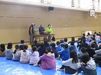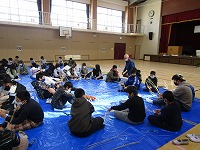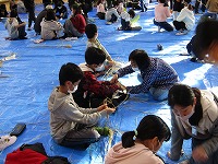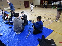 毎年、年の瀬の恒例行事として、5年生が地域の方からお正月の注連縄飾りを教えてもらいました。初めに地域の方がお手本を見せてくださり、子ども達は、真剣な顔で作り方を聞いていました。でも、いざ実際に作ってみると、「うまく縄がなえない。バラバラになるー。」など、悪戦苦闘。でも、最後にはなんとか作り上げることができ、満足な顔で終えることができました。
