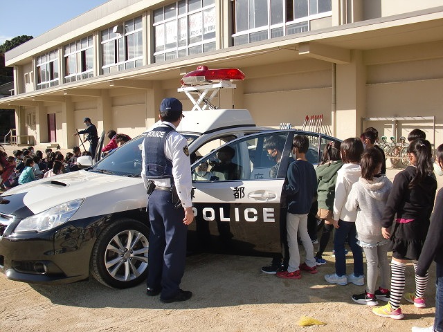 体育館では、警察官の仕事や警察署の役割についてお話を聞かせていただき、その大変さを学習しました。また、運動場には本物のパトカーが登場し、実際に車の中に乗せてもらう体験もさせてもらいました。その仕組みを説明していただいている時も、子どもたちは興味津々で、パトカーに見入っていました。