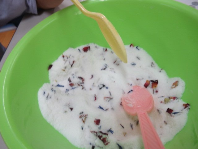 香料を選び,重曹・食塩・クエン酸などを用いて,各々素敵なアロマバスボムが完成しました。ラップで包んで形を整えて出来上がりです。