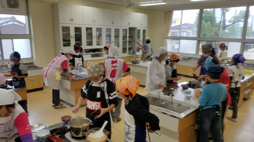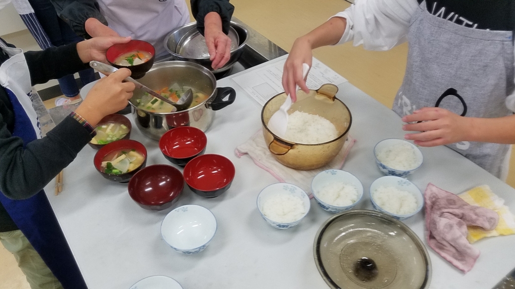 5年生が、家庭科の学習でご飯と味噌汁を作りました。今年も京田辺市の食生活改善推進委員の皆さんに協力いただき、だしの取り方を含めて教えていただきました。また、今回使用するお米は、地域の方に協力していただき自分たちで収穫したお米を使って炊きました。 子ども達は、食生活改善推進委員さんの指導のもと、グループで協力して美味しいごはんを炊き、具だくさんでだしの利いた味噌汁を作ることができ、調理した家庭科室からは美味しい香りが漂っていました。活動後、「おいしかった!」と声を挙げる子どもがたくさんおり、大満足した様子でした。