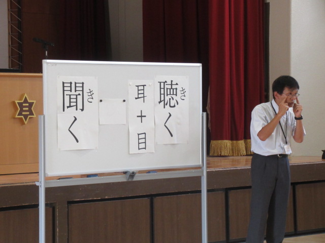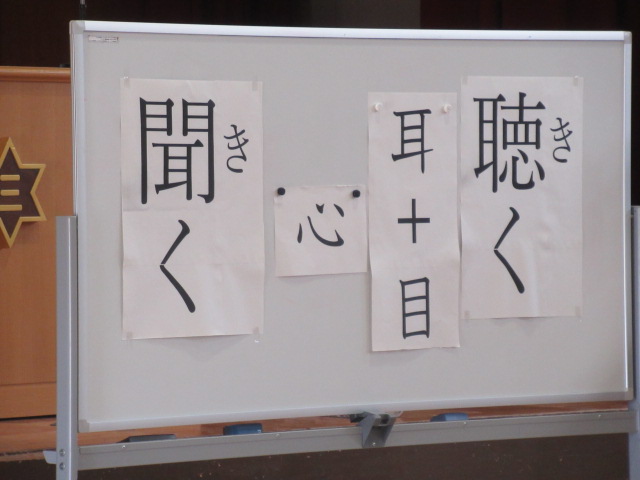 10月1日(火)、全校朝礼を行いました。校長先生のリコーダー演奏があり、今月の曲はアニメ映画「耳をすませば」の主題曲「カントリーロード」です。「聞く」と「聴く」の違いについて分かりやすくお話ししていただきました。