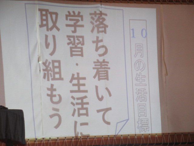 最後に10月の生活目標「落ち着いて学習・生活に取り組もう」について担当の先生から話がありました。自分の生活をもう一度見つめ直し、勉強に運動にしっかりチャレンジしてほしいと思います。