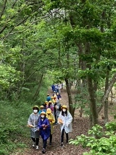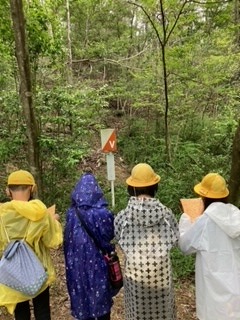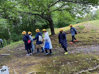 何とか雨も上がりましたが、雨具も準備万端で、グループごとにスタートしていきました。道中ではクイズを解きながら、山道を進みます。地図を頼りに、仲間と協力し、ゴールを目指して頑張ります!