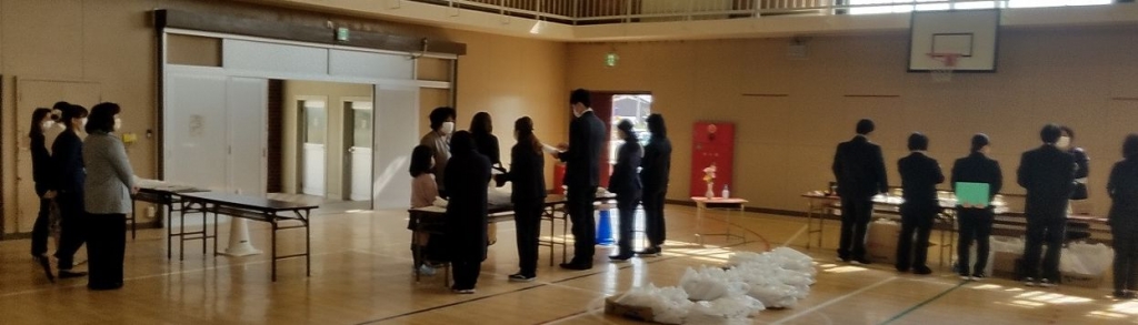 2年生から6年生は体育館で、1年生は新しい教室で受け渡しを行っています。