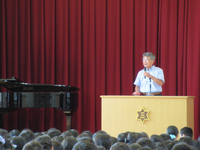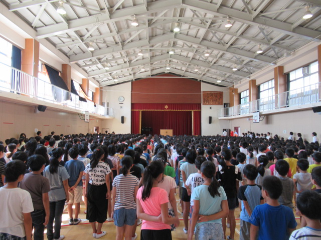 大きな声の校歌斉唱の後,校長先生の式辞では「一学期をしっかり振り返り,いろいろな経験ができる夏休みを送ってほしい。」とお話がありました。