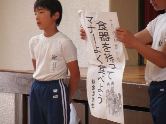 また,月目標担当の先生から10月の生活目標「落ち着いて学習・生活に取り組もう」について,給食委員会から,月目標「食器を持ってマナーよく食べよう」の話がありました。