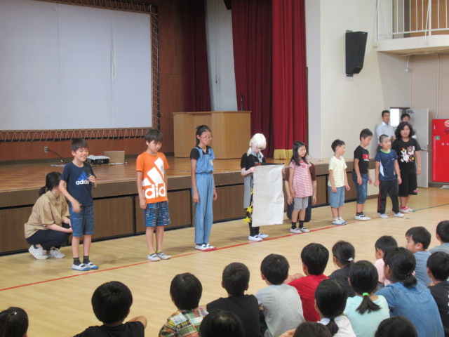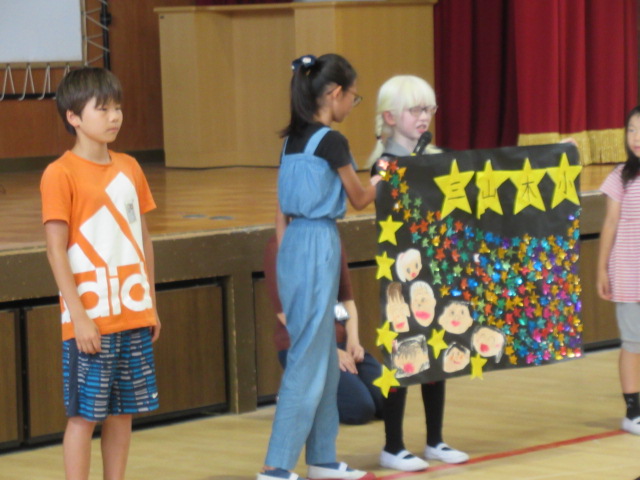 終わりに「夏の地域学校」に参加するたんぽぽ学級と児童会本部の代表から、仲のよいたんぽぽ学級をイメージした貼り絵が紹介されました。貼り絵に使った「星」は6年生が作りました。