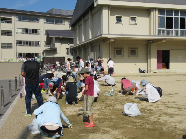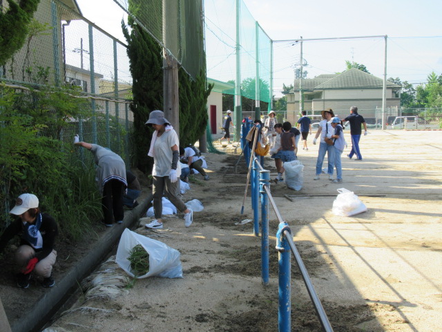 日ざしが強い中,中庭の雑草抜きやグラウンド回りの溝掃除をしていただきました。