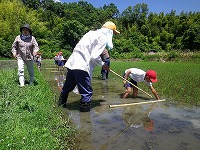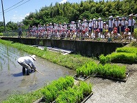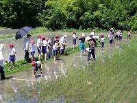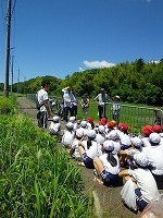 今日は、田植え体験の日。準備をして地域のおじさんの田んぼに集合です。田植えの方法を教えていただき、いよいよ自分たちで田植えを始めました。「印のところに合わせて苗を植えます」おじさんおばさんに教えていただき植えました。最初は不安そうだった5年生も田んぼに入って植え始めると「おもしろい」「きもちがいい」と楽しそうでした。稲の成長を見ながら秋には「稲刈り体験」が待っています。おじさん、おばさん、ありがとうございました。