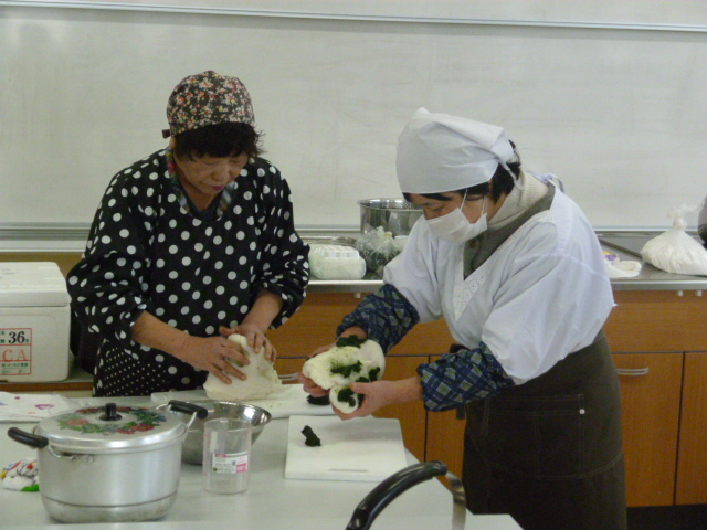 米粉などを練り上げた生地を20分ほど蒸しあげ、よもぎを混ぜて人数分に小分けします。