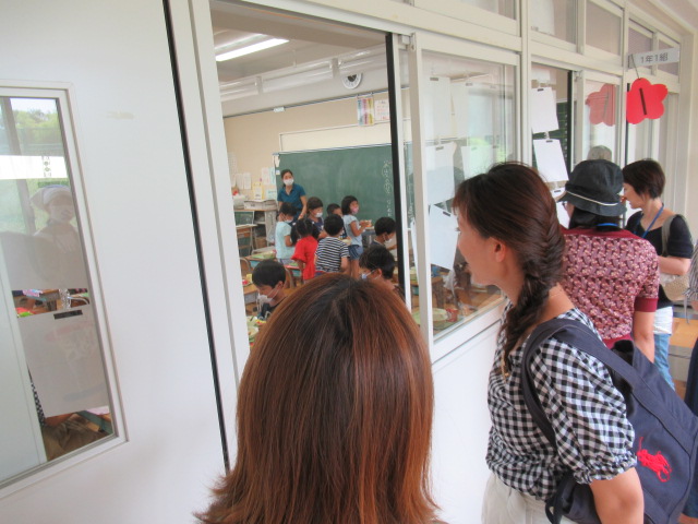1年生の給食準備や配膳の様子の参観後,本日の献立「あじの南蛮漬け・千切り大根のみそ汁」の試食をしました。「学校給食の大切さ」について管理栄養士からの説明も行いました。