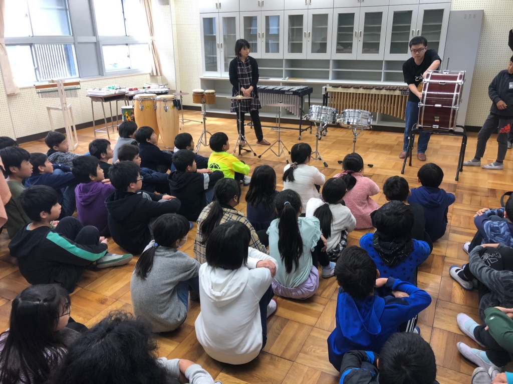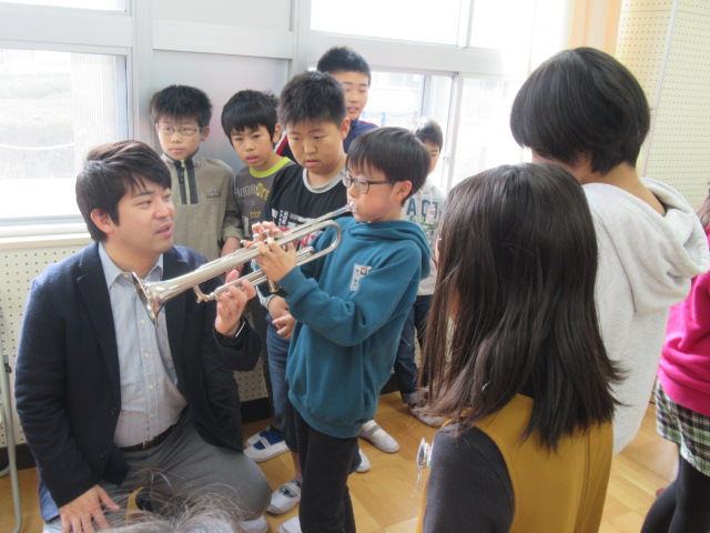 12月5日(木)、5年生はプロの音楽家をお招きして打楽器と金管楽器の演奏体験をしました。子ども達は大・小太鼓やシンバル、鉄琴、木琴等の演奏やトランペットとトロンボーンの音出しにチャレンジしました。