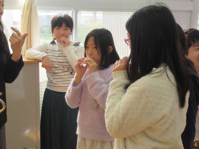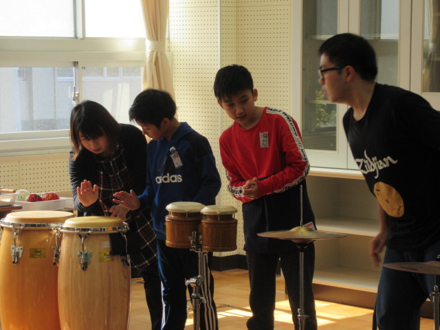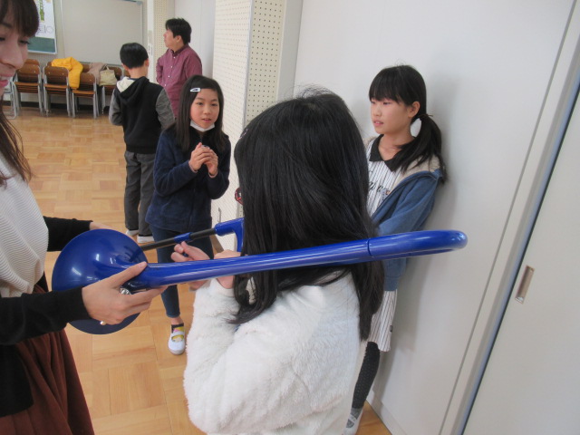 唇の震えが金管楽器の音に変わること、打楽器も打ち方を工夫すると様々な音色を奏でることにも気付けました。短い時間でしたが貴重な体験ができました。