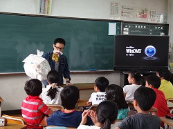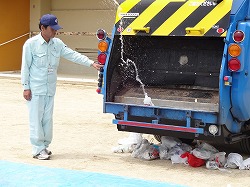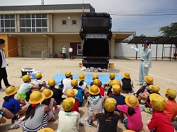 4年生は「ごみのしまつと活用」の学習をしています。5/22には「ごみ博士(市役所の方の扮装)」に来て頂いて、お話を聞きました。写真の付けひげの方がごみ博士です。「捨てればごみ。いかせば、資源。」であること等を楽しく学びました。運動場では、パッカー車の見学です。ペットボトルの中身を捨てないでごみに出すと、パッカー車に押しつぶされた時、周りに中身が飛び散るのだそうです。実演もして頂きました(上写真)。次の写真は、車の脇についている小さなスイッチです。沢山の子どもたちがそのスイッチに気づき、それが何かを質問しました。