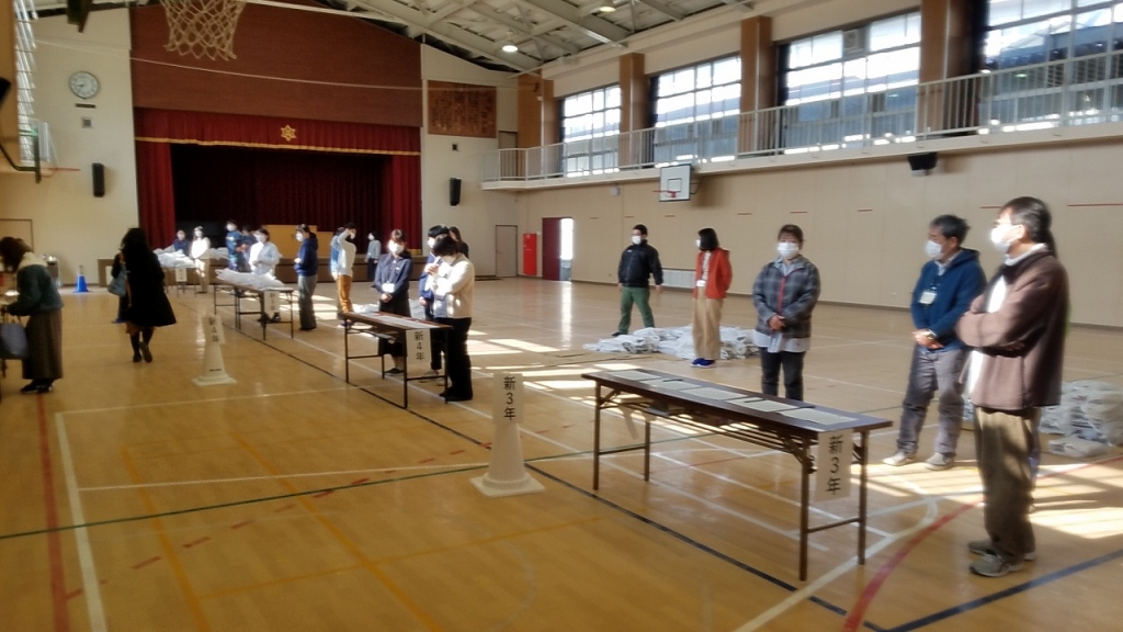 来校されましたら、体育館で引き渡しをしています。土足のままでお上がりください。また、受け取られたら、中身があるか確かめていただく机を用意しておりますので、ご確認ください。本日は16時~17時、明日は8時30分~9時30分でお待ちしております。