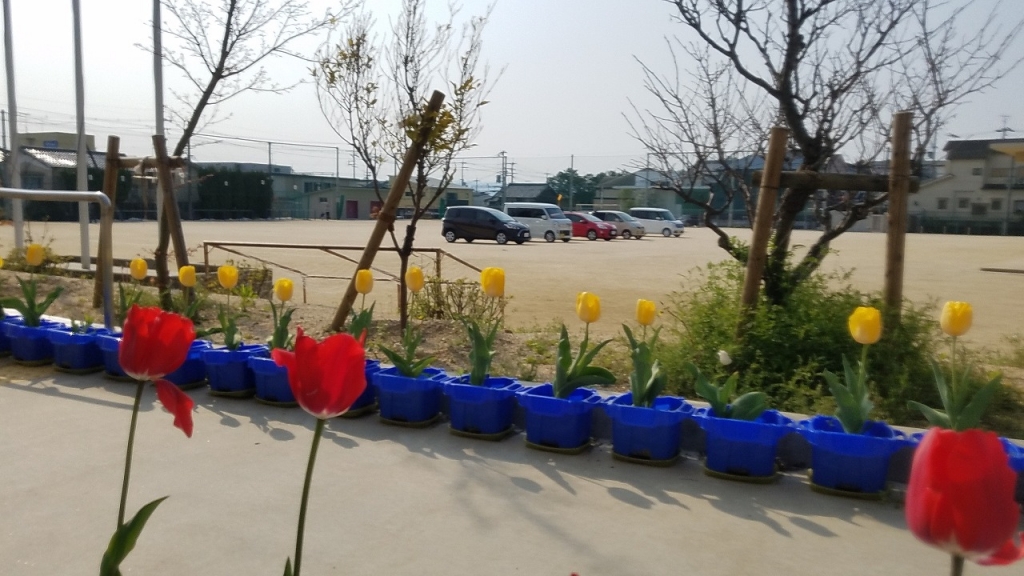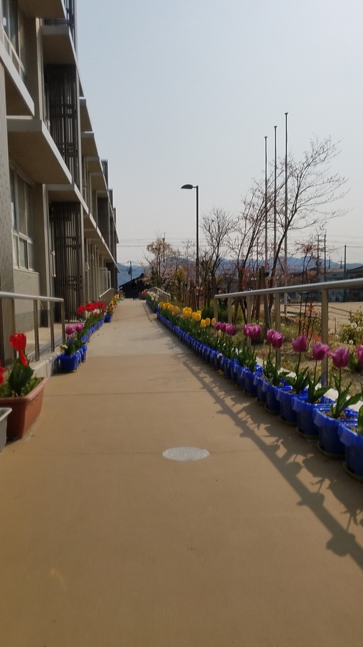 東校舎前には、チューリップメッセージでおなじみのチューリップがきれいに咲いています。来校された際は、是非ご覧ください。