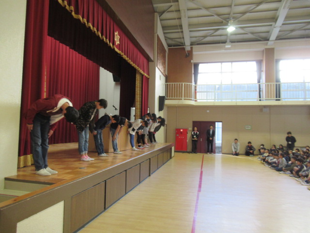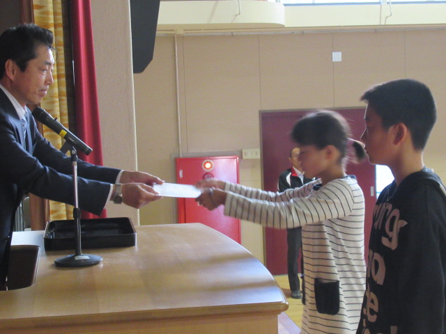 マラソン大会各学年男女,1~3位の入賞者の氏名が読み上げられ,合計36名を代表して6年生2名に表彰状が授与されました。上位入賞者だけでなく,マラソン大会参加児童全員を称える場となりました。