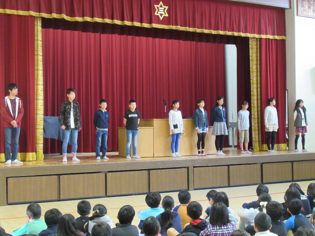 どの委員長も,全校みんなの前でわかりやすくはっきりと発表することができました。みんなが心豊かに楽しく学校生活を送れるよう,充実した活動を進めてくれることを期待しています。