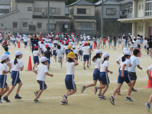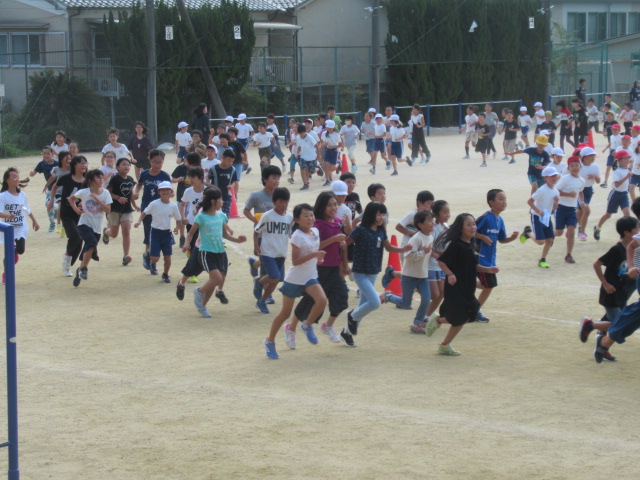 走る前に「三山木っ子体操」でウォーミングアップをした後、ペース配分を考えながら運動場の周回コースを走ります。本番までの3週間余り、各学年6回ずつジョギングを行う予定です。一人一人が自分自身に挑戦できる取組にしてほしいと思います。