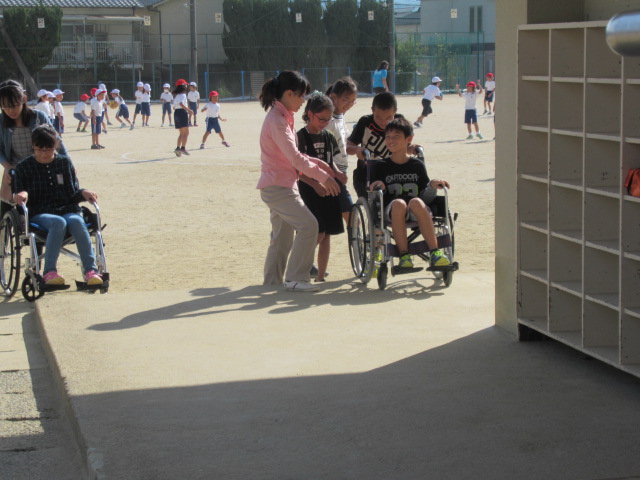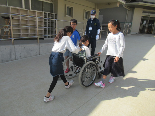 10月17日(水)、5年生は社会福祉協議会とボランティアグループ「ぴんぽーん」のみなさんのお世話になり、福祉学習の一貫として車いすの体験をしました。グループ毎に役割を交代しながら体育館周辺の段差やスロープでの乗り心地や車いすの操作を体感しました。
