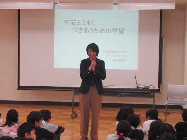 2月7日(木)、4年生は田辺中学校のスクールカウンセラー金子先生をお招きして「不安とうまくつきあうための学習」を行いました。