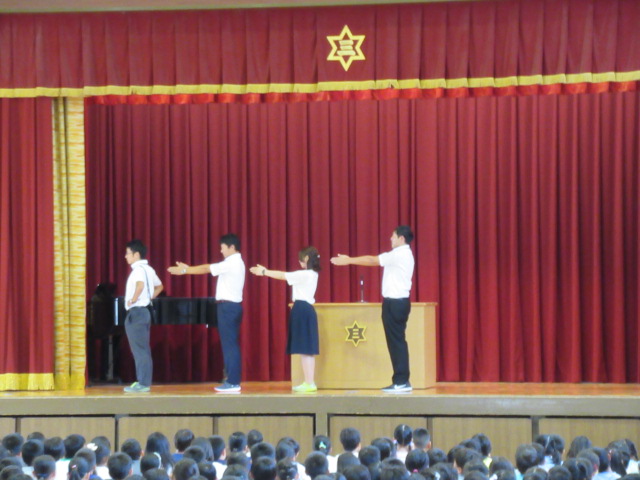 式の後,担当の先生方から転入生の紹介・今月のめあて・整列の仕方について確認がありました。2学期はいろいろな行事があるので協力してがんばりましょう!