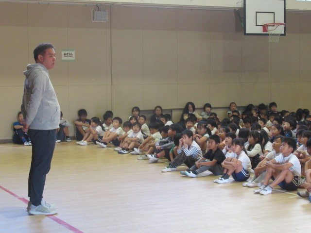 10月2日(火)の全校朝礼では、校長先生から、10月からの後半6ヶ月間で頑張る目標をしっかりたてること、延期になった明日の運動会で練習した成果を出し切ってほしいことのお話がありました。次に10月の生活目標「落ち着いて学習・生活に取り組もう」について担当の先生からお話がありました。