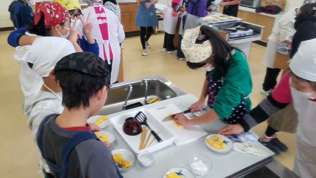 子ども達は班に一人ついて頂いている推進委員さんから、包丁の扱い方や卵焼きのつくり方を丁寧に教わりながら、調理していました。