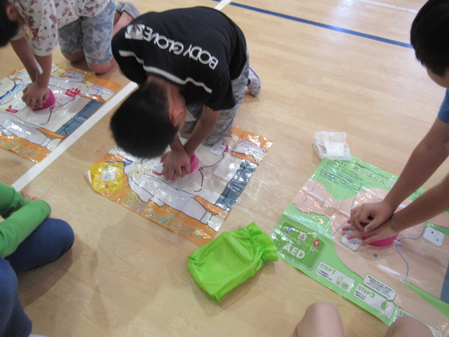 6月12日(火),6年生は京田辺市消防署の方にお世話になり,緊急時の救命法について学習しました。まず,AED練習キットで,心臓マッサージの仕方とAEDの取り扱い方を学びました。