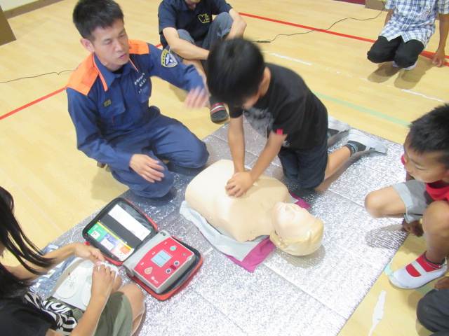 次に立体模型と「AEDの実物」を使い,蘇生法の手順を全員が実際に疑似体験しました。
