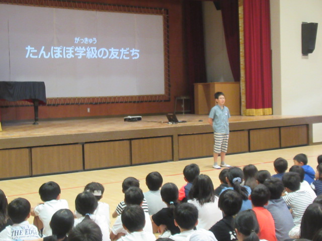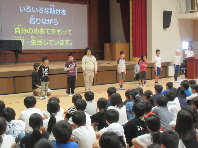 5月20日(月)の朝礼では、「たんぽぽ学級」について学習しました。たんぽぽ学級児童の自己紹介の後、担任の先生から教室の様子について説明がありました。