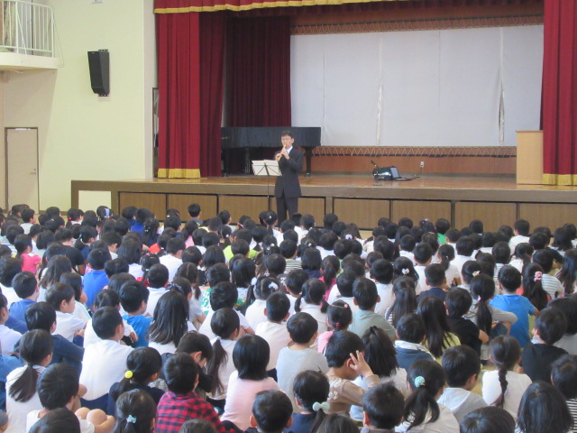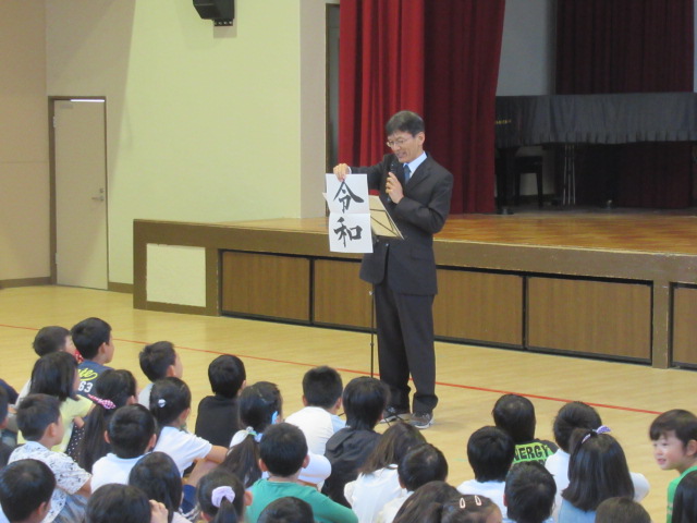 5月7日(火)の朝礼は、校長先生のリコーダーによる「こいのぼり」の演奏からスタートしました。新しい元号「令和」の意味や手話での表し方を教えてもらうと共に、新しい月にもう一度心新たにスタートしていこうというお話でした。