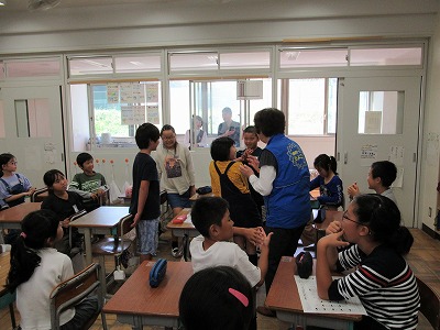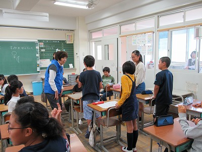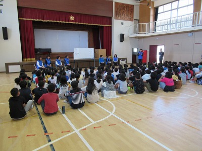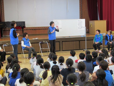 4年生全員が集まった体育館では、手話でのあいさつの仕方を教えていただき、子どもたちの質問にも答えていただくなど、耳の不自由な方の生活について学習させていただきました。また、その後は各教室に分かれ、一人一人が自分の名前を手話で表す活動をさせてもらいました。