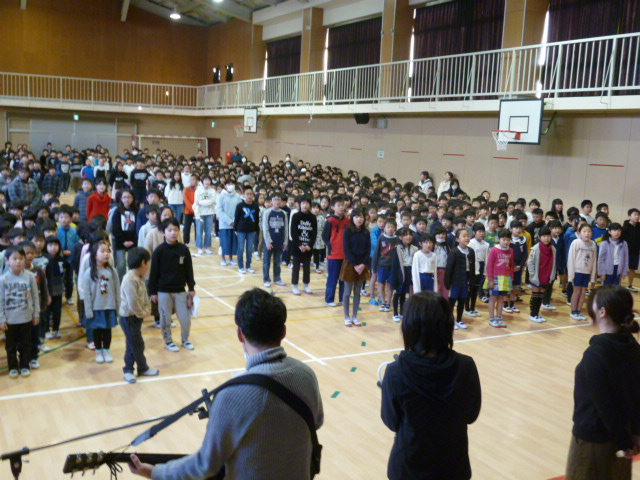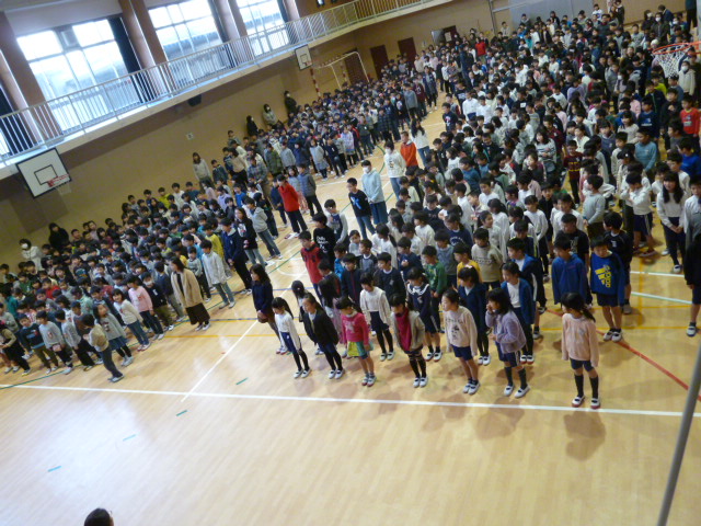 2月18日(月)、朝礼では1~5年生が「6年生を送る会」に向けて在校生合唱「未来列車」の練習を行いました。
