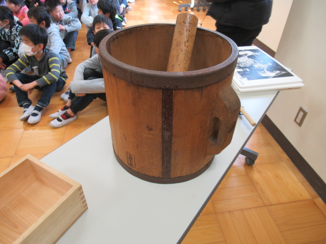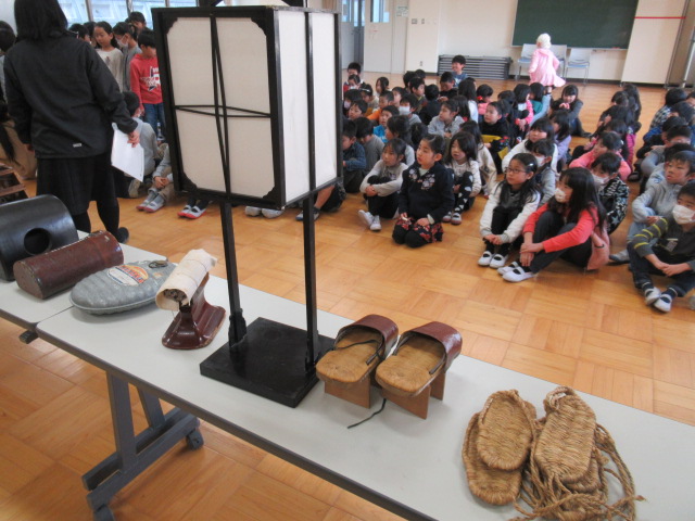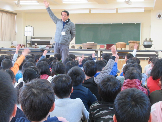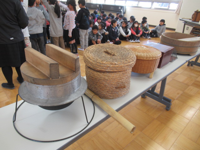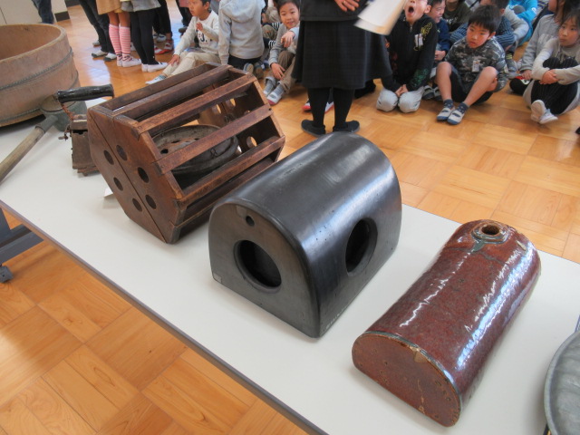 2月9日(金)、今回も山城郷土資料館の職員の方にお世話になり,3年生の社会科「昔の道具と人びとのくらし」で学んだ、「昔使っていたいろいろな道具」についてお話をきかせていただきました。約50~60年前まで実際に使われていた道具の説明に子ども達は熱心に聞き入っていました。