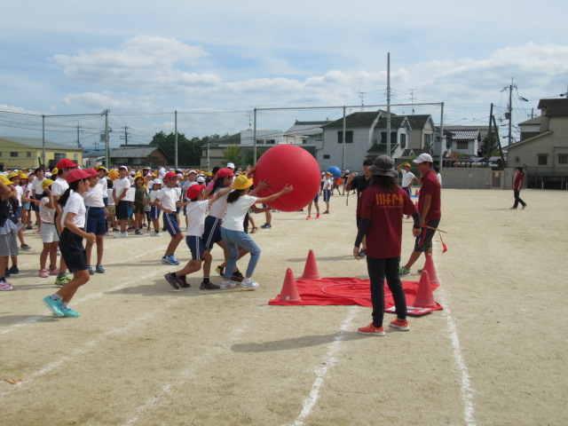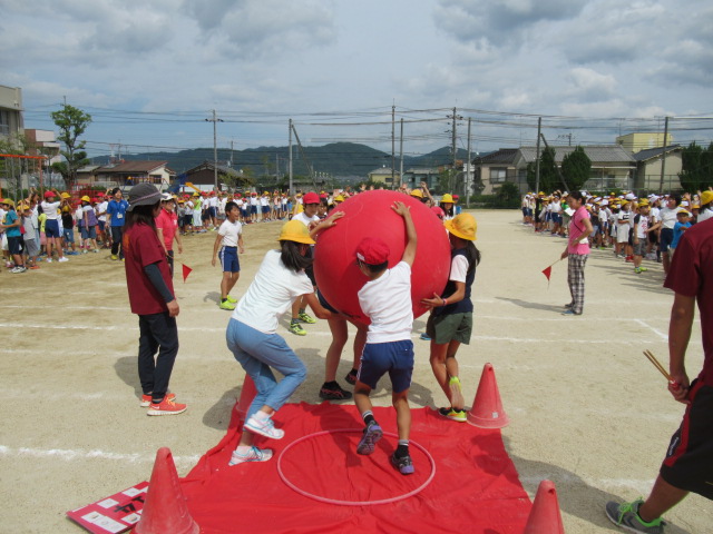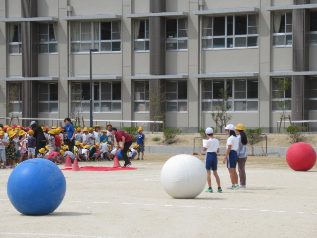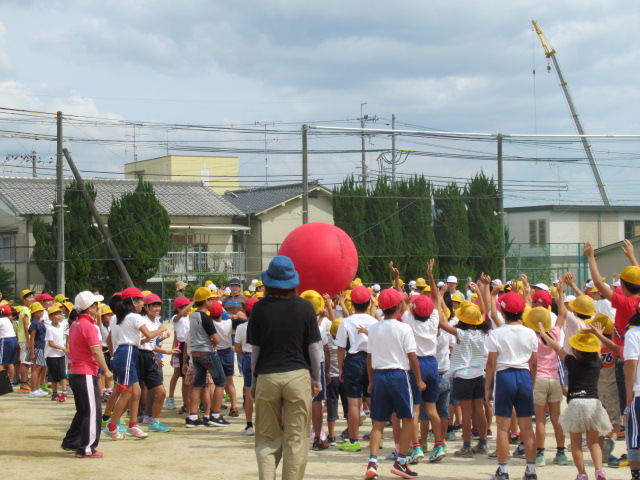 今年の児童会種目は「大玉送り」です。児童にとっては大きいと感じる直径約1mの球を使います。