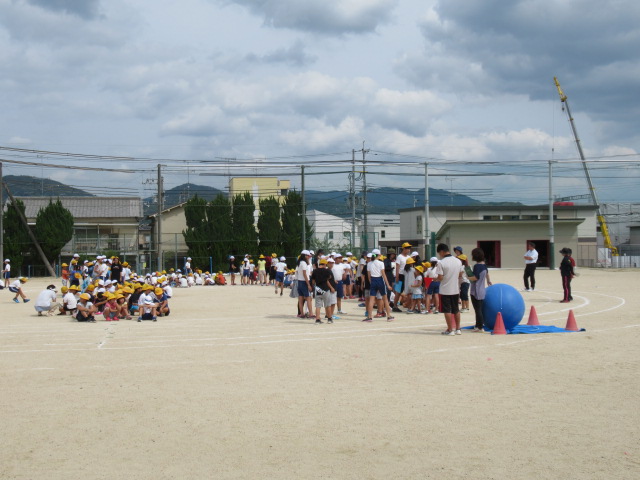 今日は一回目の練習で,各児童が自分の並ぶ位置を確かめました。その後,ルールを確認しながら「大玉送り」の練習を行いました。
