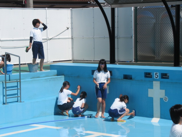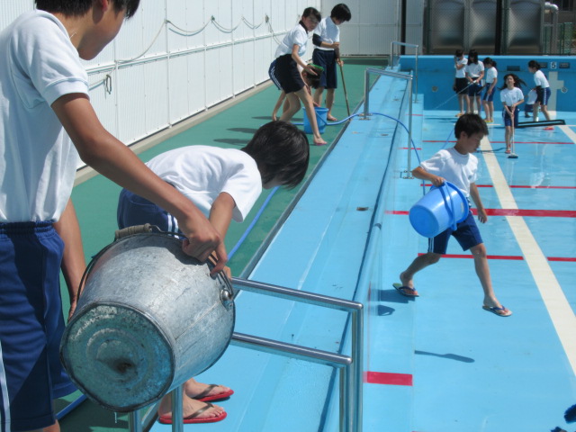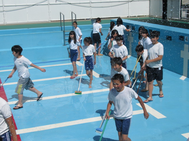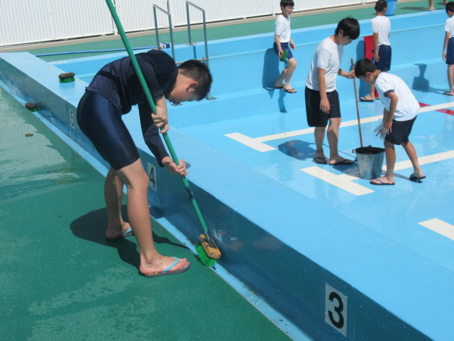 水着の上に体操服の出で立ちでデッキブラシやたわしなどの道具を手にして,一生懸命掃除をする姿は,さすがは6年生と思える立派な態度でした。