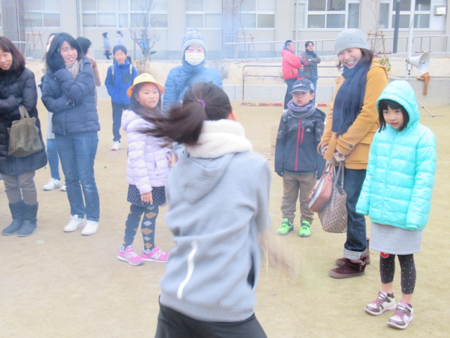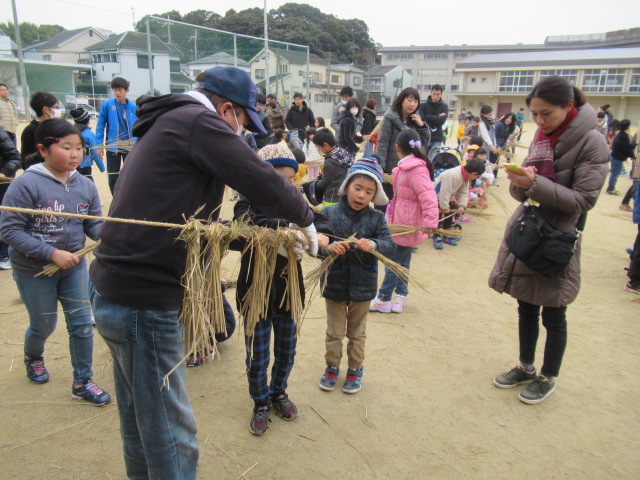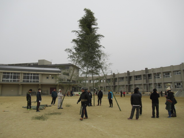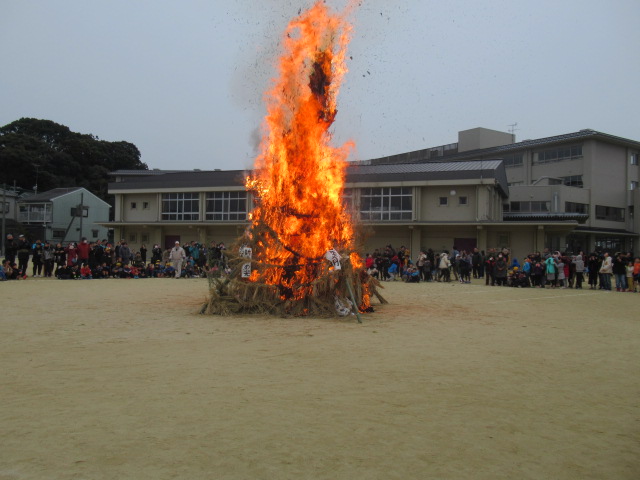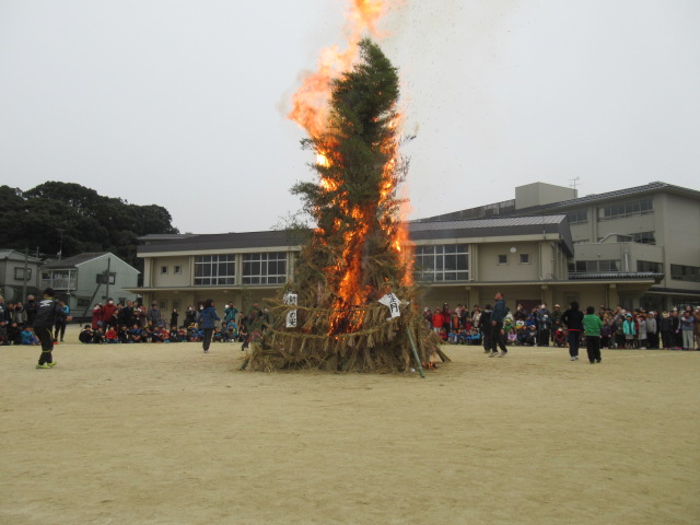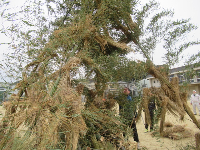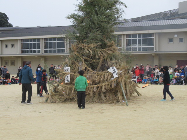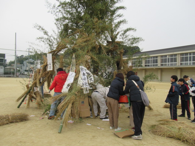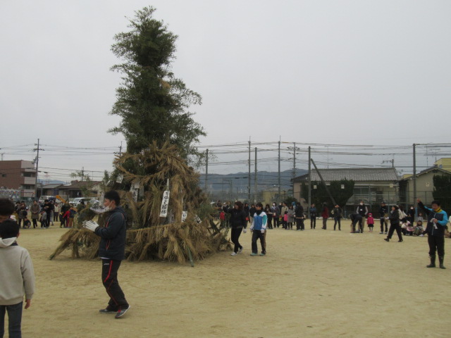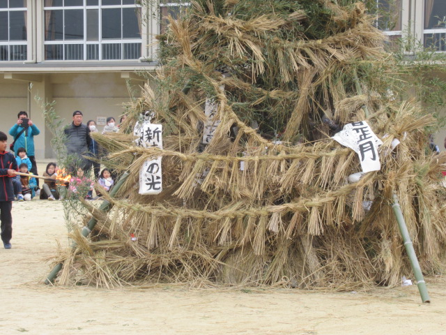 1月12日(土)、ふるさと三山木体験学習「とんど」が行われました。早朝8時頃から宮ノ口地区の方々を中心に「やぐら作り」をしていただき、午前9時の開会式前から大勢の児童や保護者、地域の方々に参加していただきました。