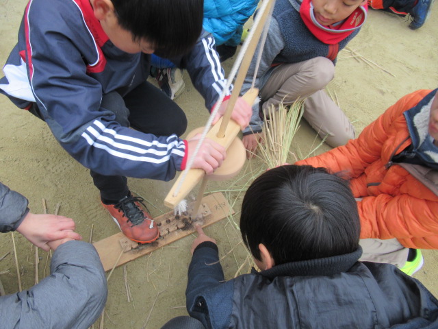 開会式の後、5年生を中心に種火づくりを行い、他学年の児童や地域の方々はやぐらに巻き付ける「はかま」づくりを行いました。