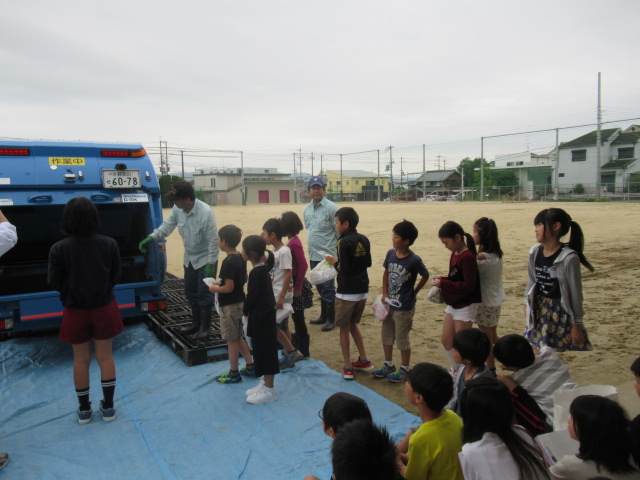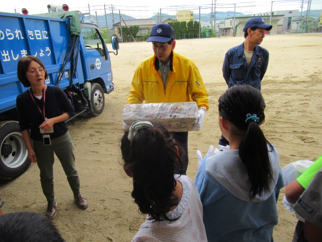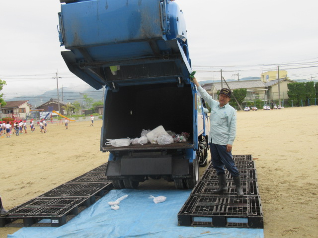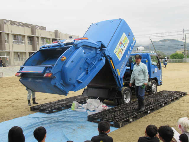 4年生は社会科で「ごみのしまつと利用」を学習しています。5月31日(木)には,市の環境衛生センター甘南備園の職員の方々にお越しいただき,収集したごみの処理方法を教えていただきました。燃えるごみを収集するパッカー車の動きや音を体感しながら説明を聞きました。