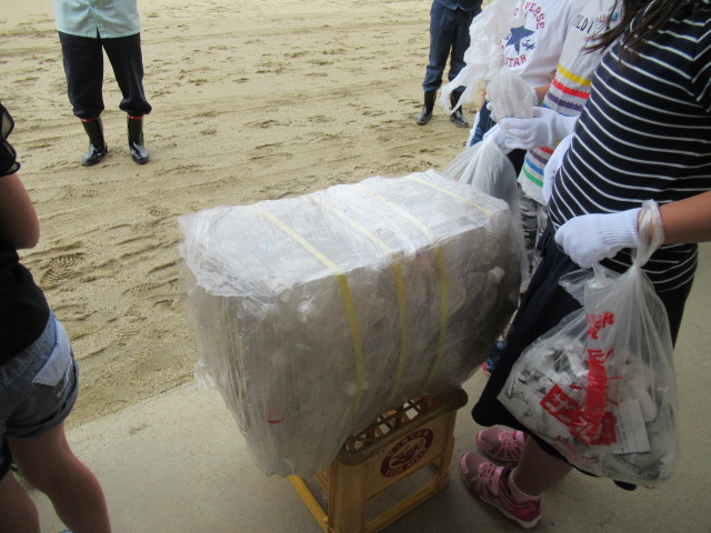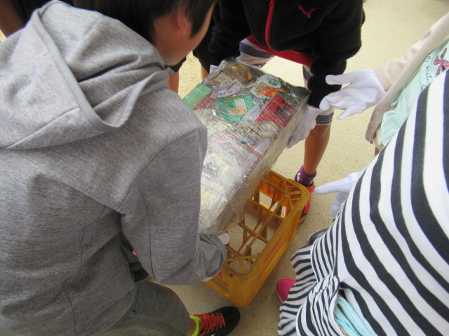 リサイクルごみは,センターで圧縮処理された後それぞれの加工処理施設へ運ばれるそうです。圧縮されたスチール缶・ペットボトル・アルミ缶の重さの違いを持ち上げて確かめました。
